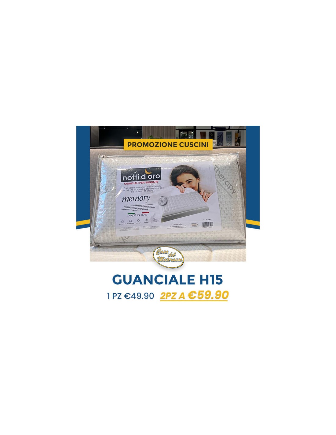 Guanciali in Memory massaggiante, fodero in fibra d’argento sfoderabile e lavabile.